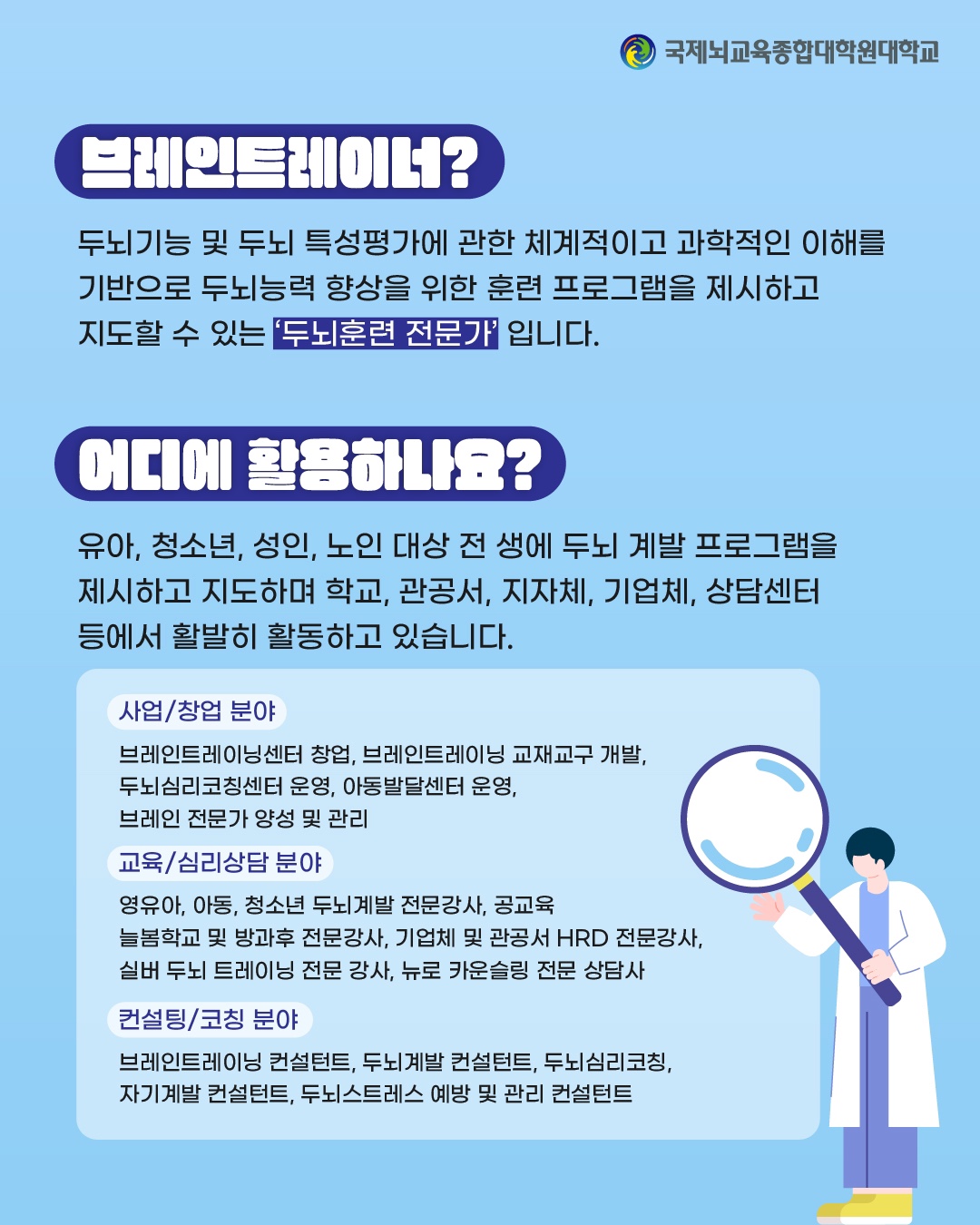 µÎ³úÈÆ·Ã ºÐ¾ß À¯ÀÏ ±¹°¡°øÀÎ ¹Î°£ÀÚ°ÝÀÎ ºê·¹ÀÎÆ®·¹À̳ʴ µÎ³ú±â´É ¹× µÎ³ú Ư¼ºÆò°¡¿¡ °üÇÑ Ã¼°èÀûÀÌ°í °úÇÐÀûÀÎ ÀÌÇØ¸¦ ±â¹ÝÀ¸·Î ´ë»óÀÚÀÇ µÎ³ú´É·Â Çâ»óÀ» À§ÇÑ ÈÆ·ÃÇÁ·Î±×·¥À» Á¦½ÃÇϰí ÁöµµÇÒ ¼ö ÀÖ´Â µÎ³úÈÆ·ÃºÐ¾ß ±¹°¡°øÀÎ ÀÚ°ÝÁõÀ̸ç, ±¹Á¦³ú±³À°Á¾ÇÕ´ëÇпø´ëÇб³°¡ ¹ß±Þ±â°üÀÌ´Ù.
