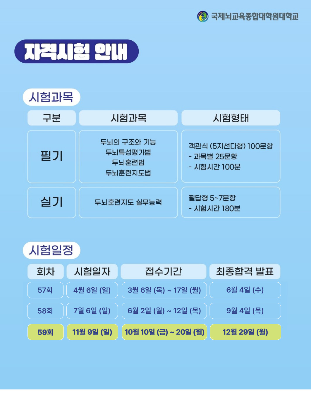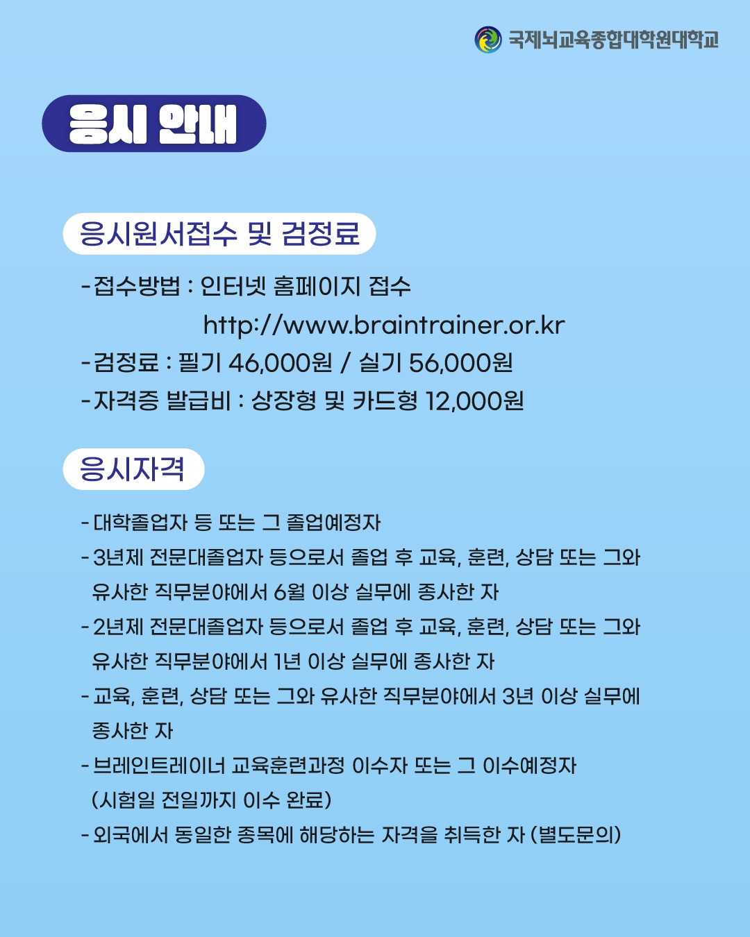±¹°¡°øÀÎ ºê·¹ÀÎÆ®·¹ÀÌ³Ê ÀڰݰËÁ¤½ÃÇèÀº Çʱâ½ÃÇèÀ¸·Î µÎ³úÀÇ ±¸Á¶¿Í ±â´É, µÎ³úƯ¼º Æò°¡¹ý, µÎ³úÈÆ·Ã¹ý, µÎ³úÈÆ·ÃÁöµµ¹ý 4°³ °ú¸ñÀ» Ä¡¸£¸ç, ½Ç±â½ÃÇèÀº µÎ³úÈÆ·Ã Áöµµ¸¦ À§ÇÑ ½Ç¹«´É·Â°Ë»ç·Î ÇÊ´äÇüÀ¸·Î ±¸¼ºµÇ¾î ÀÖ´Ù.