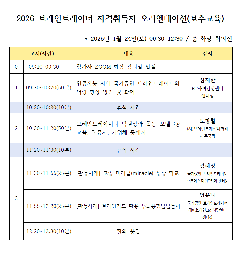 ¡Ø ±âŸ ÀÚ¼¼ÇÑ »çÇ×Àº BTȨÆäÀÌÁö(https://www.braintrainer.or.kr)/ °øÁö»çÇ×/ [ZOOM Ȱ¿ë ½Ç½Ã°£ ¿Â¶óÀÎ ±³À°] ºê·¹ÀÎÆ®·¹ÀÌ³Ê ÀÚ°Ý ÃëµæÀÚ ¿À¸®¿£Å×ÀÌ¼Ç Âü°¡ ½Åû ¾È³»¸¦ Ŭ¸¯ÇÏ¿© È®ÀÎ ¹Ù¶ø´Ï´Ù. °¨»çÇÕ´Ï´Ù