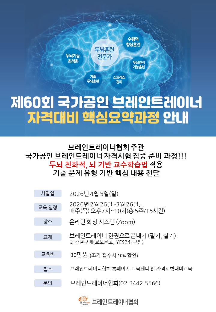 2026³â 4¿ù 5ÀÏ(ÀÏ) ½ÃÇàµÇ´Â Á¦ 59ȸ ±¹°¡°øÀÎ ºê·¹ÀÎÆ®·¹ÀÌ³Ê ÀڰݽÃÇèÀ» À§ÇÑ ºê·¹ÀÎÆ®·¹À̳ÊÇùȸ ÁÖ°ü ¿Â¶óÀÎ 5ȸÂ÷ Çٽɿä¾à°úÁ¤À» ¾Æ·¡¿Í °°ÀÌ ÁøÇàÇÏ¿À´Ï, ÀÚ°Ý Ãëµæ¿¡ °ü½ÉÀÖ´Â ºÐµéÀÇ ¸¹Àº °ü½É°ú Âü¼®À» ¹Ù¶ø´Ï´Ù.