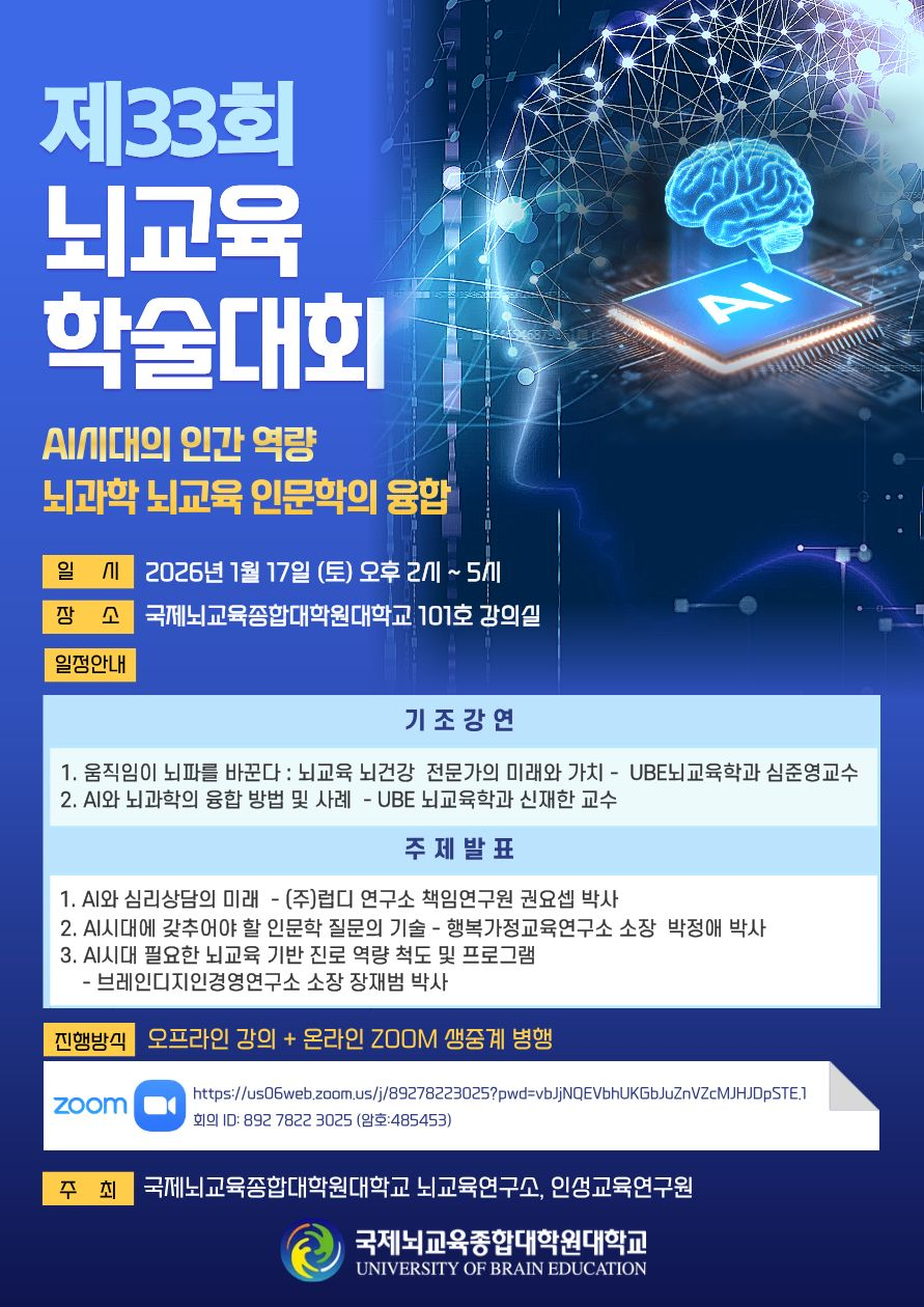 ±¹°¡°øÀÎ ºê·¹ÀÎÆ®·¹ÀÌ³Ê ÀÚ°Ý¹ß±Þ ±â°üÀÎ ±¹Á¦³ú±³À°Á¾ÇÕ´ëÇпø ´ëÇб³ ³ú±³À°¿¬±¸¼Ò¿¡¼´Â 'AI ½Ã´ëÀÇ Àΰ£ ¿ª·®: ³ú°úÇз³ú±³À°·Àι®ÇÐÀÇ À¶ÇÕ'À̶ó´Â ÁÖÁ¦·Î Á¦33ȸ ³ú±³À° Çмú´ëȸ¸¦ ¿ÀÇÁ¶óÀÎ ¹× ¿Â¶óÀÎÀ¸·Î °³ÃÖÇÕ´Ï´Ù.